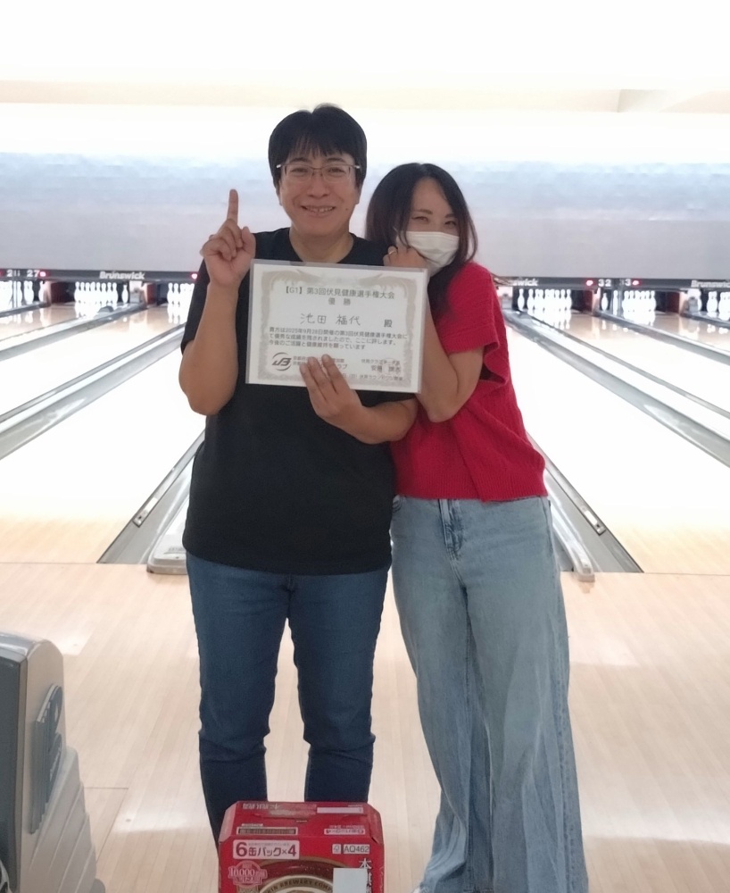 第3回伏見健康選手権大会 【G1】 | 【優勝】池田福代選手208ピン 【準優勝】吉村秀晴選手192ピン 【第3位】安藤康志選手191ピン 【第4位】廣澤英作選手189ピン 【第5位】宿谷浩一選手181ピン ※決勝スコア 【葛西香織選手(ゲスト)】157ピン |