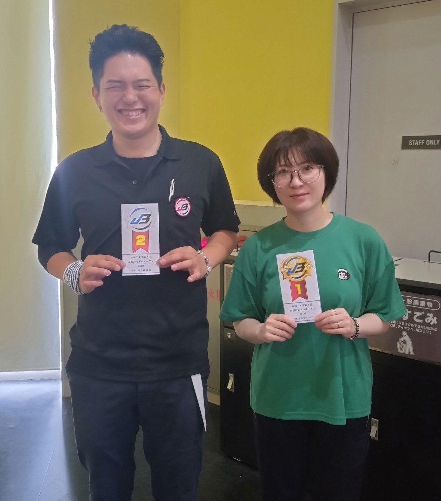 【開催日程】2025年9月14日(日)【会場】ラウンドワンスタジアム京都伏見店地元開催でのミドルオープン競技大会、伏見クラブ員2名でワン・ツーを達成しました。【優勝】山田 みわ 選手【準優勝】我孫子 知哉 選手