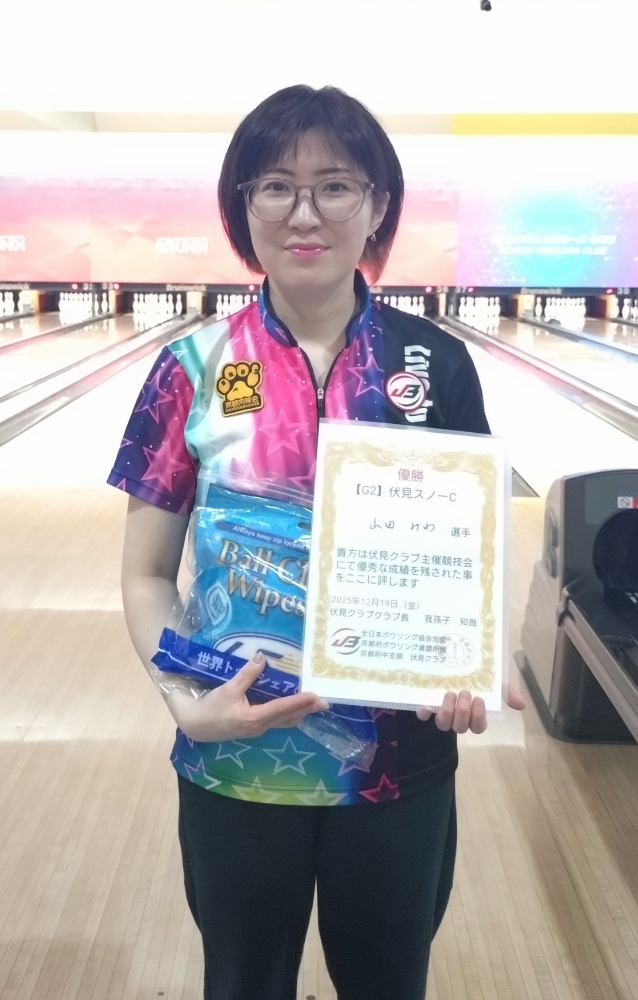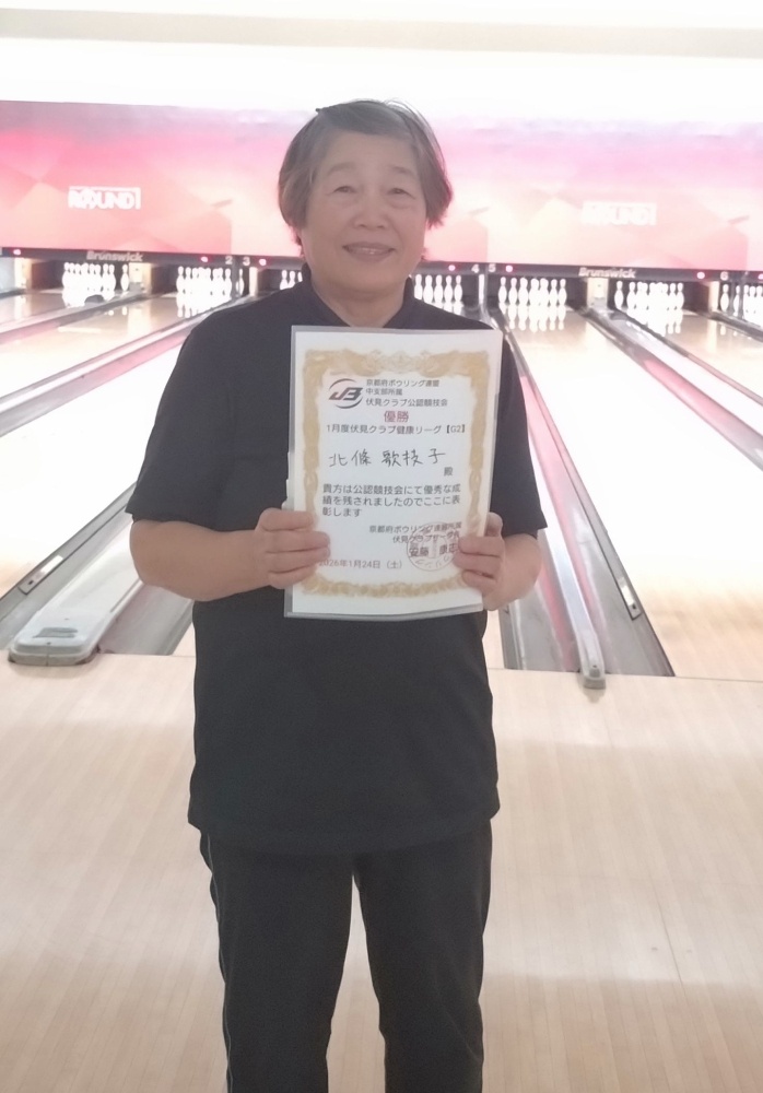 【開催日程】2026年1月24日(土)【優勝者】北條歌枝子 選手(C級) ※選手ランクは優勝時点C級北條選手が初優勝のVでポイント500点を獲得し、早速にB2級に昇級されました。2026年度4月より伏見クラブ新規加入選手も加わり、ますますリーグ戦も熱くなる予感【優勝】北條歌枝子 選手 941ピン